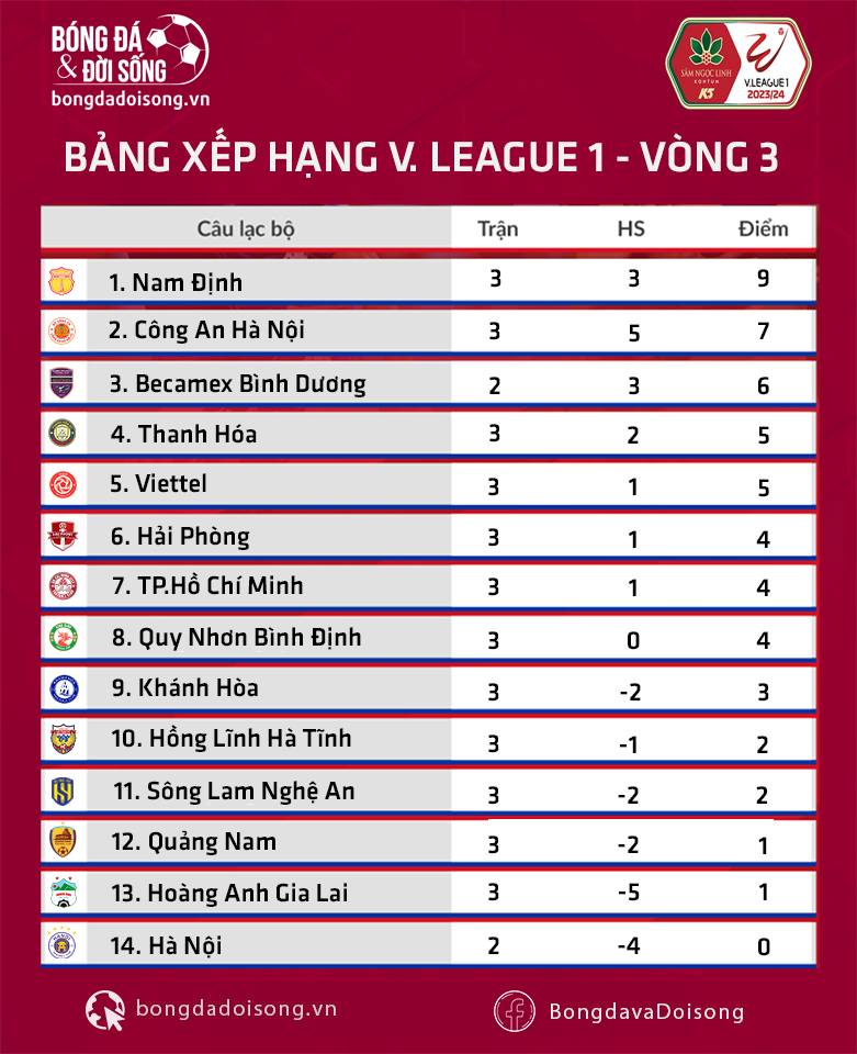 Sau 3 vòng, những đội bóng có tiềm lực mạnh như Nam Định, CLB Công an Hà Nội, Bình Dương, Viettel đều chiếm giữ các vị trí đầu bảng. Hà Nội FC là bất ngờ khi xếp chót bảng với 2 trận thua./.